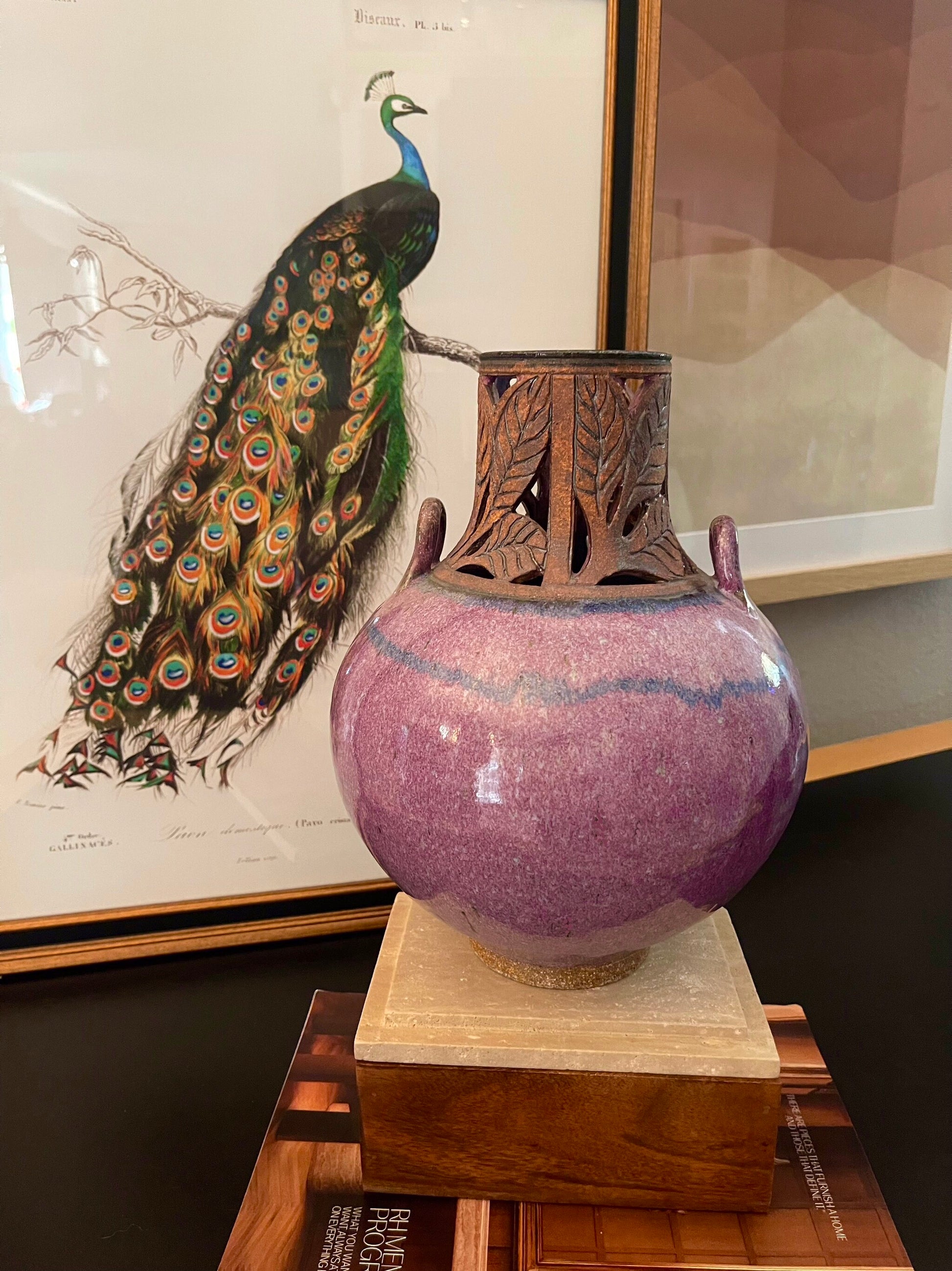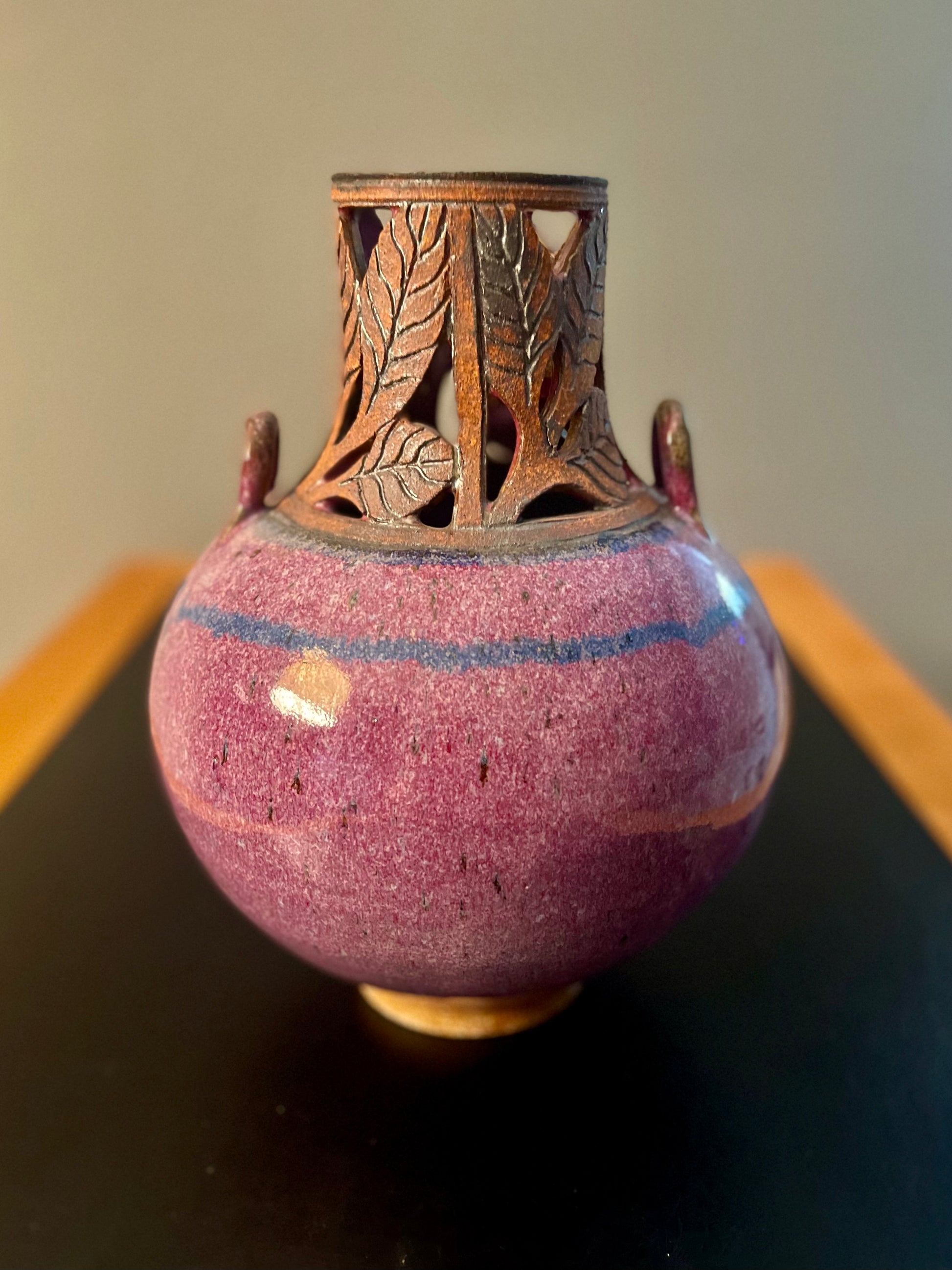 The vase has a round, bulbous shape that tapers towards the narrow base. The vase has a mottled, purplish-pink color with a slight iridescent sheen.