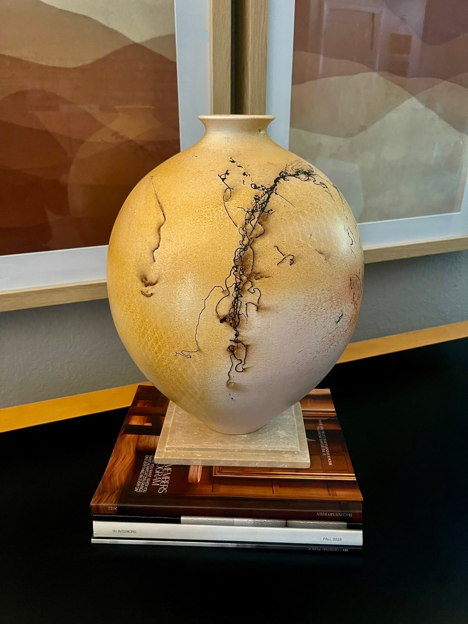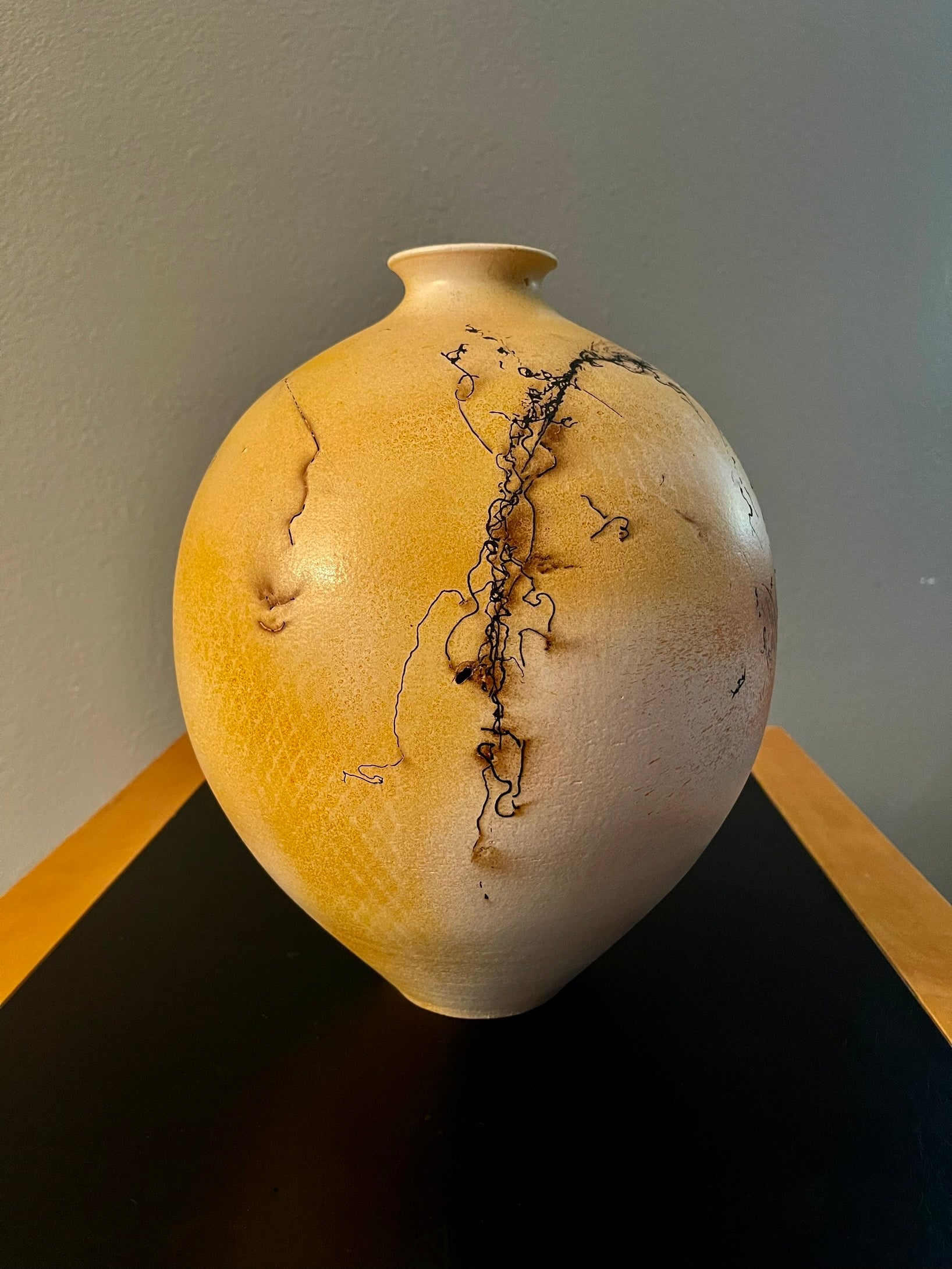 The black pattern element was actual horse-hair placed on the vase while it was in an intense heat condition creating a unique design effect as if the pattern is lifted from the vase’s surface.