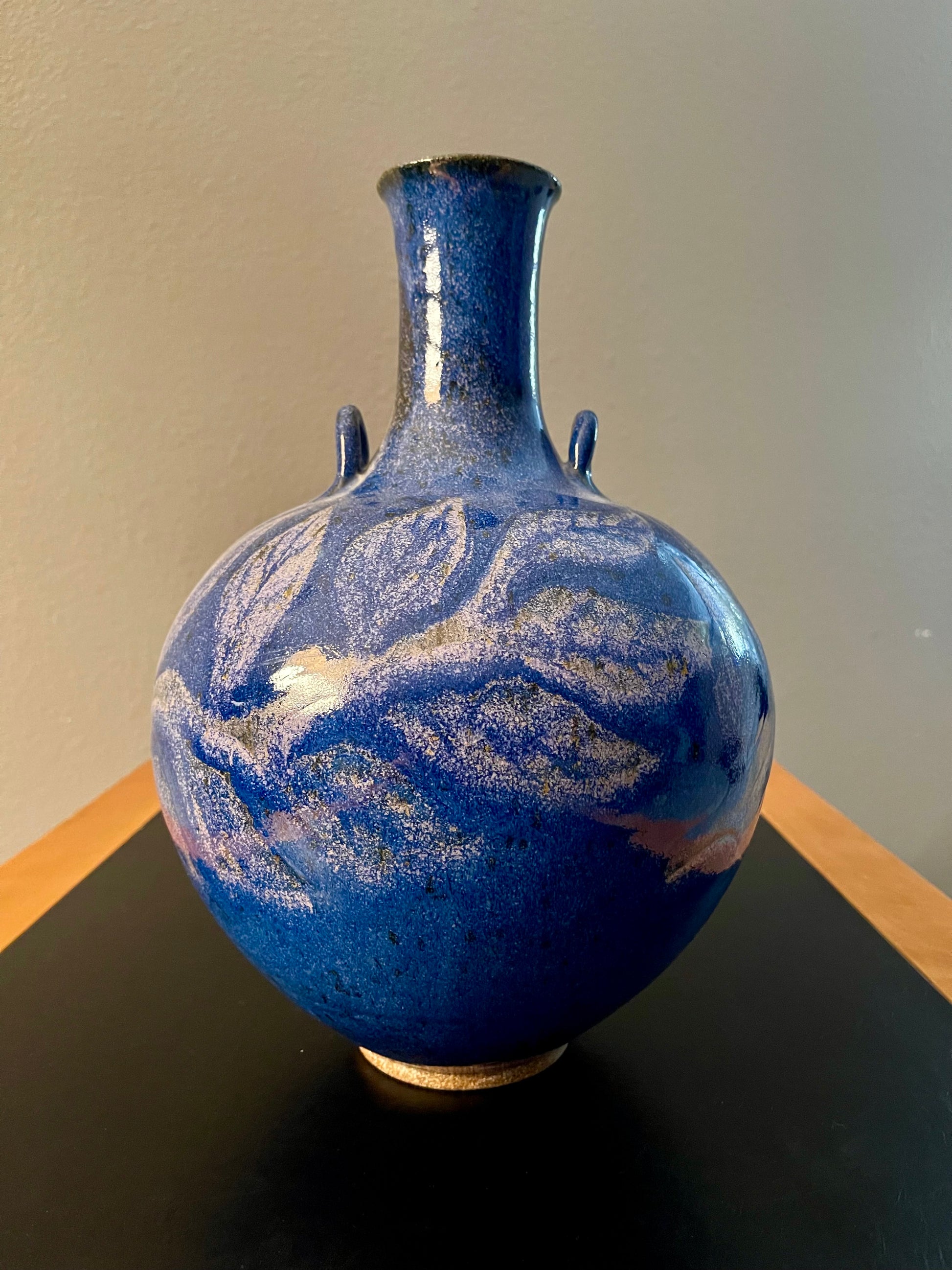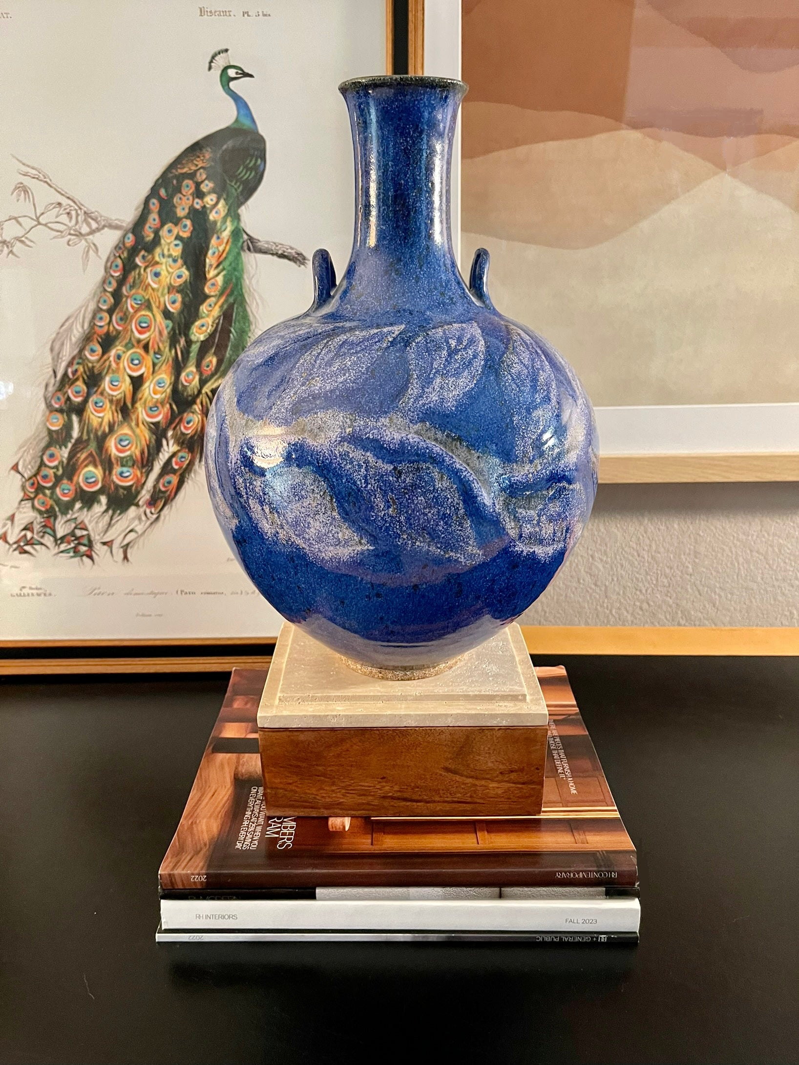 The striking vase features an abstract, flowing design created by the variations in the blue glaze. Swirls and patterns emerge from the interplay of lighter and darker blue tones, giving the piece a sense of movement and fluidity.