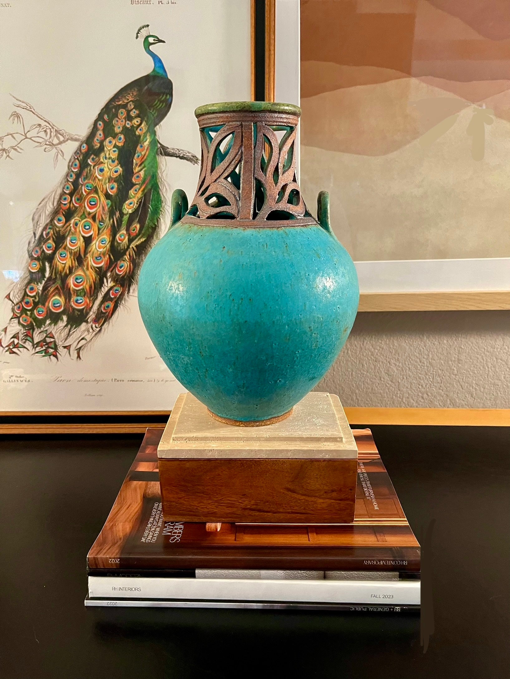 The body is a solid turquoise color with a slightly mottled appearance, suggesting a rich glaze.The main body of the vase is a vibrant turquoise blue, reminiscent of the prized Persian turquoise. The neck and handles appear to be a contrasting bronze or copper color.