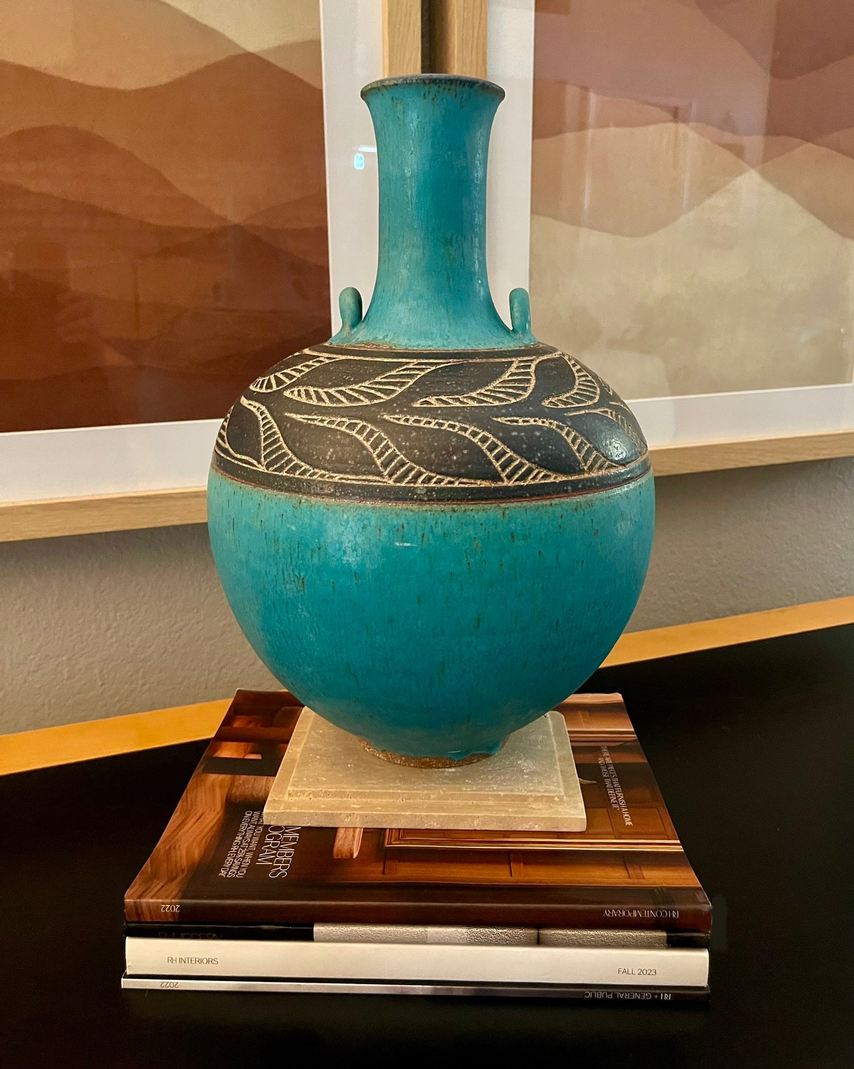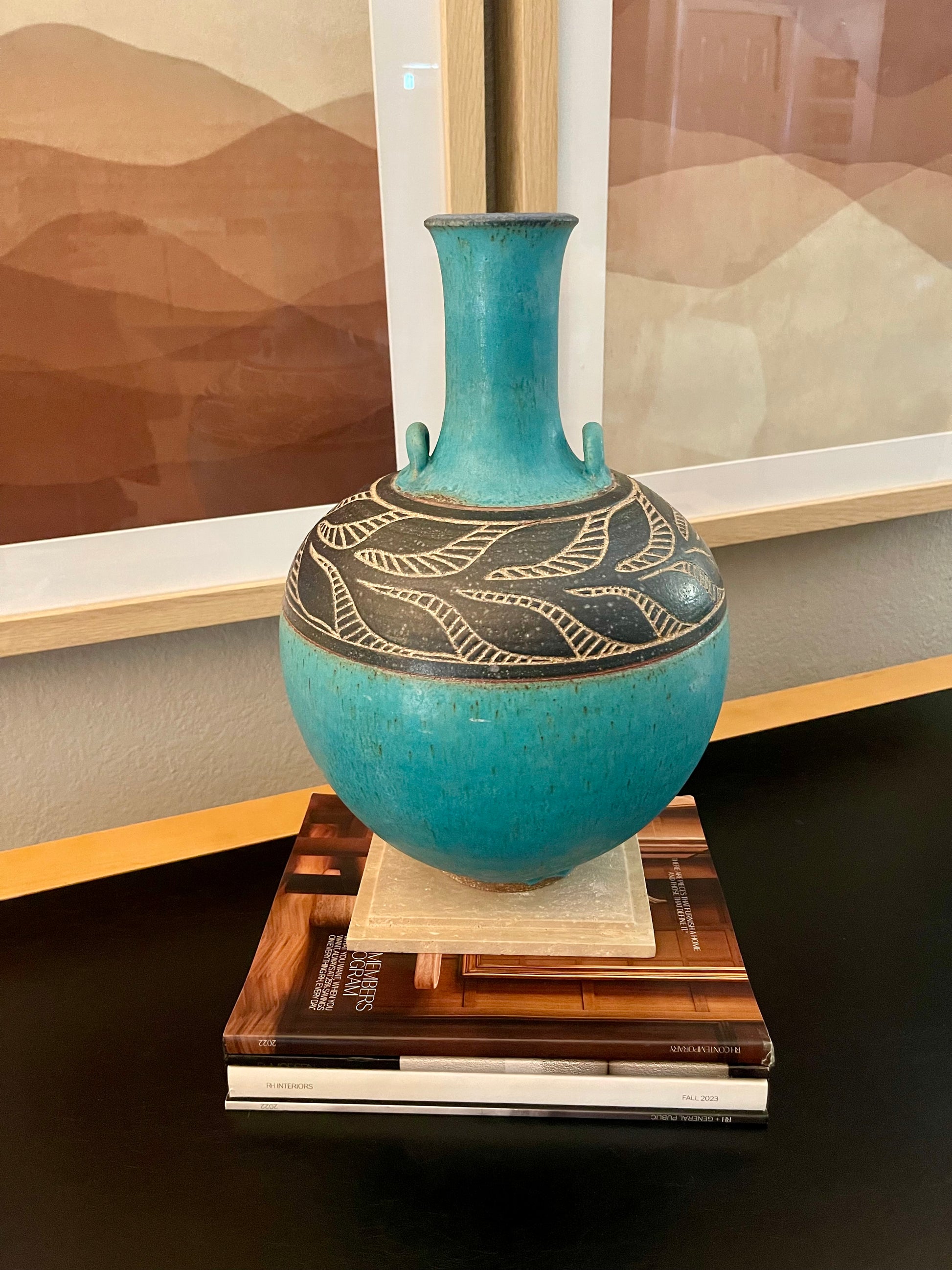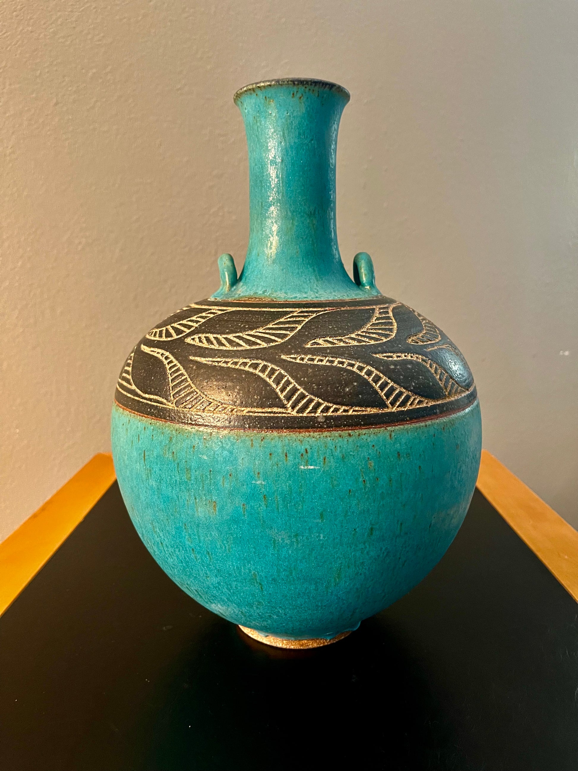 The surface has a matte finish with slight variations that suggest a handcrafted quality. The carved design on the shoulder of the vase adds textural interest and the dominant color is a vibrant turquoise green with blue overtone, which covers most of the vase's body and neck.